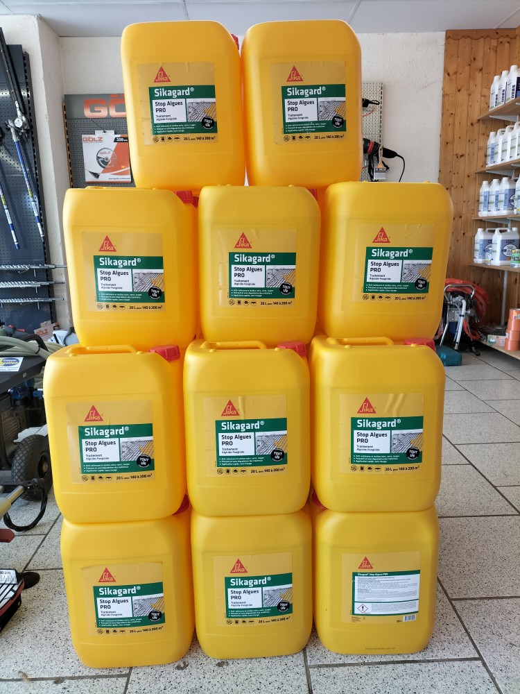 vous propose le produit anti-mousse Sika contre les algues vertes, rouges et noires. 49€ le bidon de 20L.